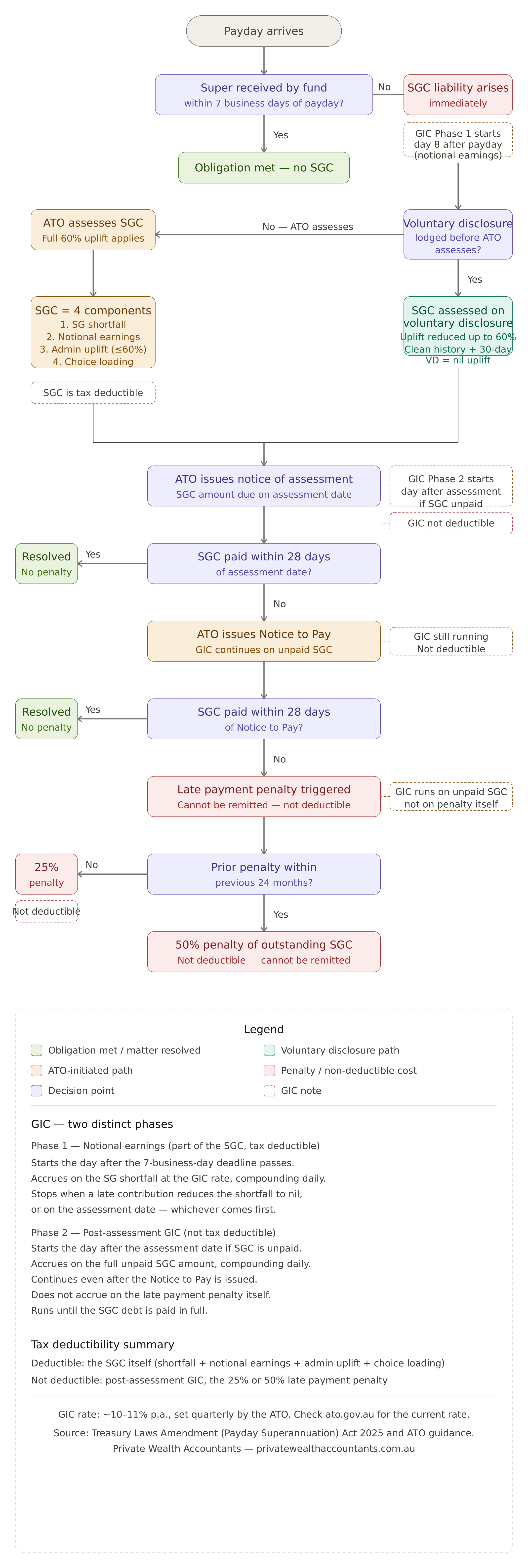 Unlike the current SGC, the new SGC itself is tax deductible. However, interest on unpaid SGC and any late payment penalties are not deductible. Interest accrues on any unpaid SGC from assessment date. If you don’t pay the SGC within 28 days of assessment, a further notice to pay is issued, and non-payment then leads to a late payment penalty of 25% (or 50% if you’ve had a penalty in the previous 24 months) — which cannot be remitted.